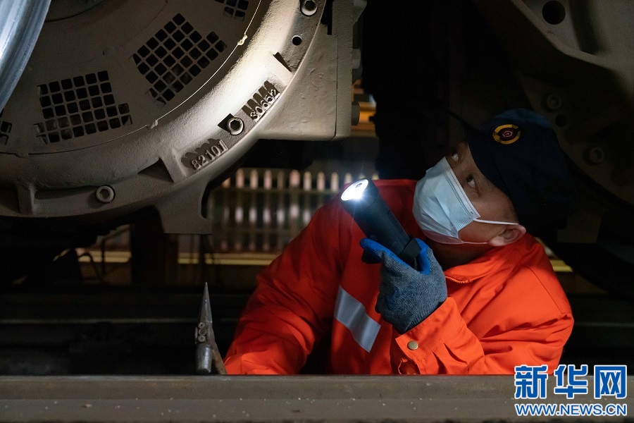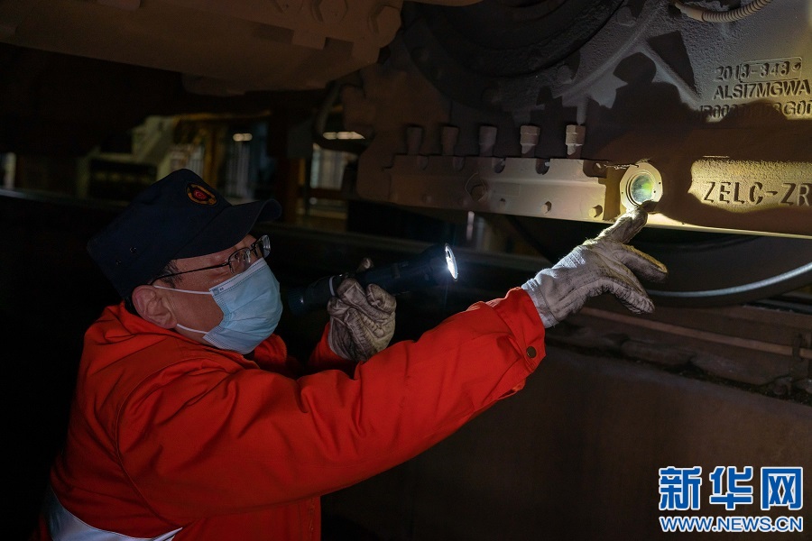 王德军正在对机车走行部进行检修。新华网发 赵磊 摄