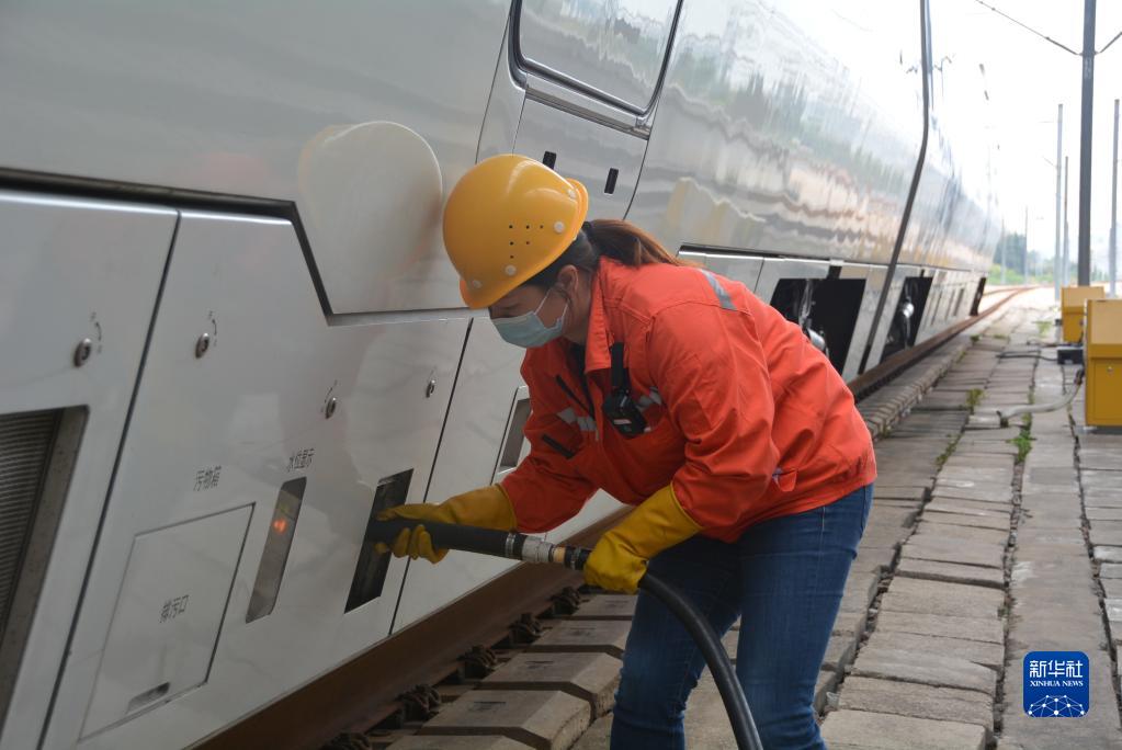 列车停站时,汪美端将水管插入列车水箱内完成注水作业。新华社记者 颜之宏 摄