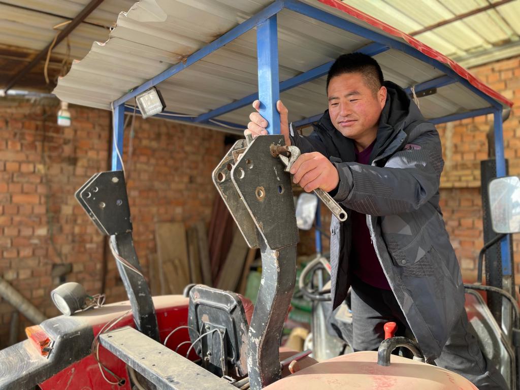 尹想成在检修挖药机。(新华社记者郭刚 摄)