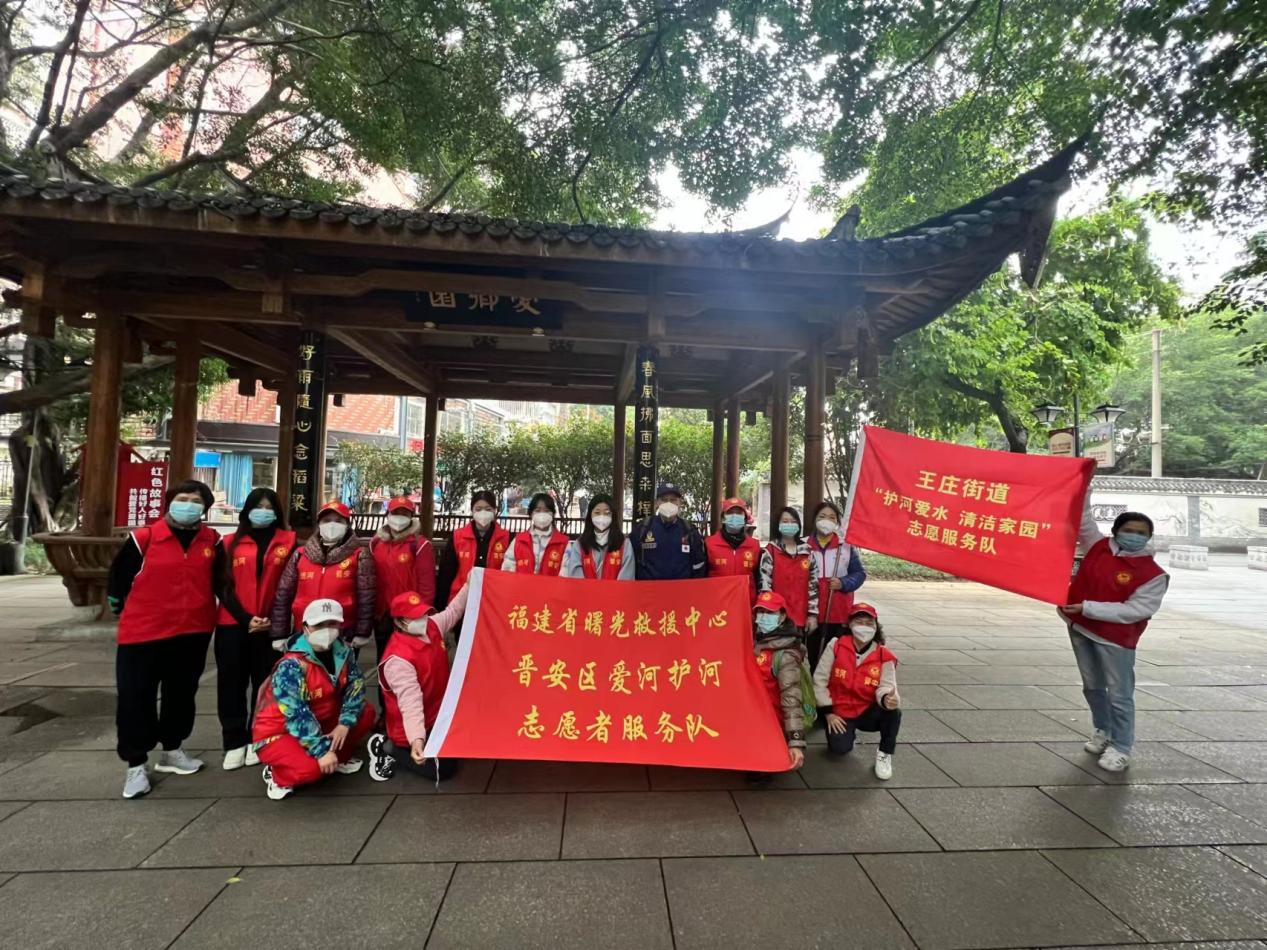 图为福建省曙光救援中心组织社会志愿者们清洁晋安河沿线