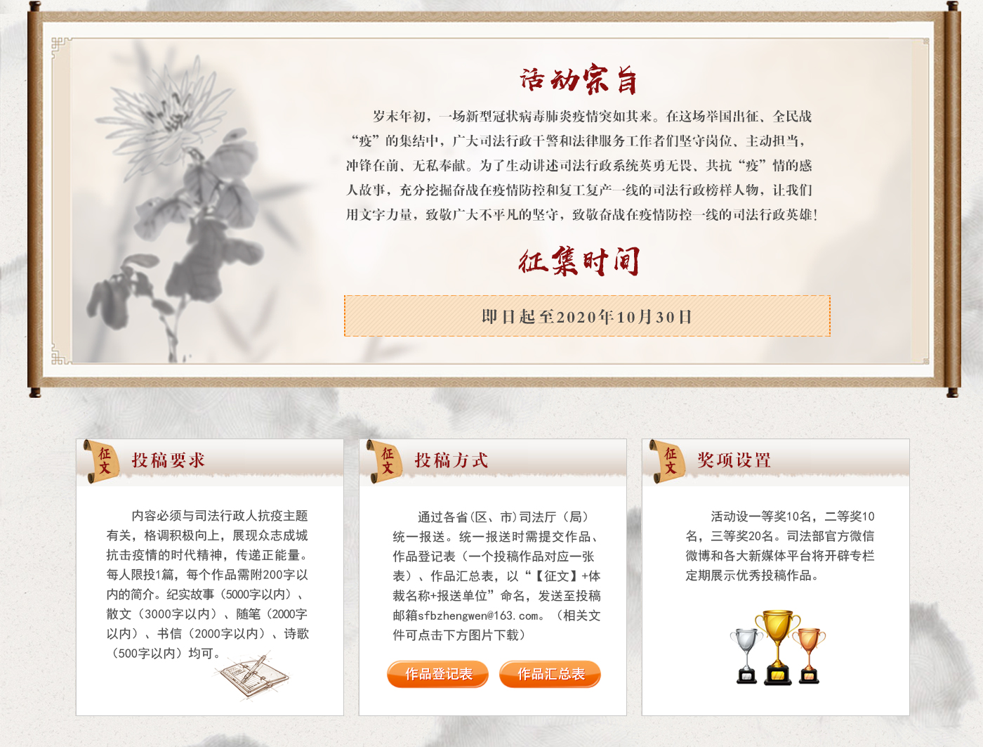近日,司法部“致敬战疫英雄”征文活动评选结果正式揭晓。经过初评、复评,评选出一等奖10件...[详细]