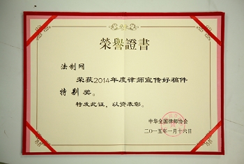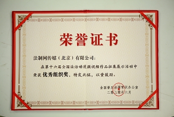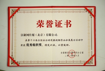 法治网在2014年“全国百家网站暨'中国普法'官方微博宪法知识竞赛活动”中荣获优秀组织奖