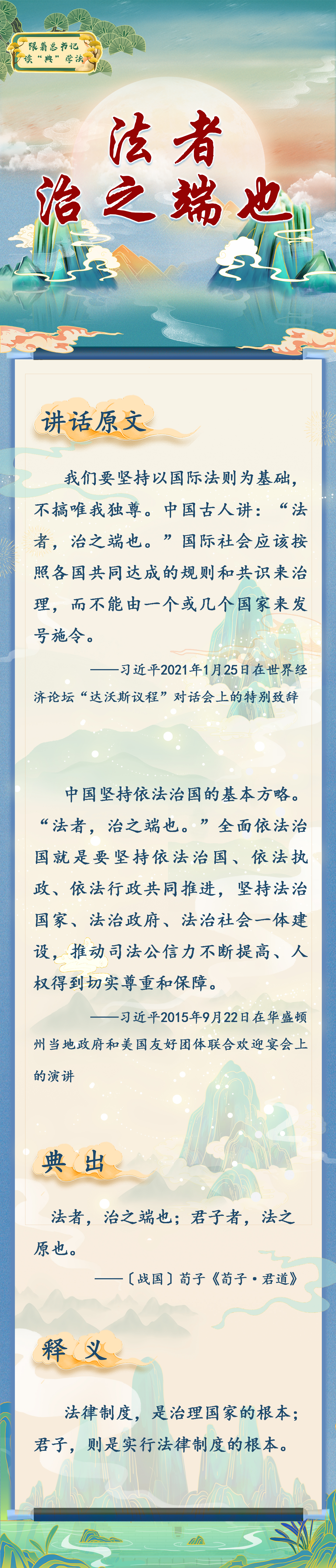 “法者,治之端也;君子者,法之原也”这一经典格言出自春秋战国时期杰出思想家荀子。荀子乃集儒家思想和法家思想之大成者,是主张“礼”“法”共治的先行者。这一格言的前半句说的是法、法治的重要性,后半句说的是君子及其所体现的礼、礼治的重要性。习近平总书记在多个讲话中引用荀子这一经典格言并赋予新的时代精神和治国理政智慧,用以说明“法”对于治国安邦的前提性、先导性、基础性作用,阐明“法治兴则民族兴,法治强则国家强”的历史规律;要求发挥好法律所具有的定分止争、惩恶扬善、引领风尚、凝聚共识、保障发展、维护稳定、应对风险的作用;要完善中国特色社会主义法治体系,筑法治之基、行法治之力、积法治之势,发挥法治固根本、稳预期、利长远的作用,为全面建设社会主义现代化强国提供坚强法治保障。同时,要坚持依法治国和以德治国相结合,一手抓法治、一手抓德治,“法安天下,德润人心”;要抓住各级领导干部这个“关键少数”,让他们在全面依法治国、全面从严治党中起到关键作用。