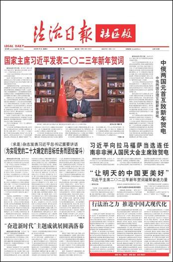 今年是全面贯彻落实党的二十大精神的开局之年。我们要坚持以习近平新时代中国特色社会主义思想为指导,深入学习贯彻习近平法治思想,全面贯彻落实党的二十大精神,筑法治之基、行法治之力、积法治之势,同心同德、同向同行,一往无前、顽强拼搏,坚定不移推进中国式现代化。要坚持和加强党的全面领导,坚持以人民为中心的发展思想,坚持走中国特色社会主义法治道路,全面推进国家各方面工作法治化。要更好发挥宪法在治国理政中的重要作用,增强立法系统性、整体性、协同性、时效性,强化行政执法监督机制和能力建设,全面准确落实司法责任制,建设覆盖城乡的现代公共法律服务体系,深入开展法治宣传教育,提升社会治理法治化水平。要坚持稳中求进工作总基调,充分发挥法治的引领、规范、保障作用,完整、准确、全面贯彻新发展理念,更好统筹国内国际两个大局,更好统筹疫情防控和经济社会发展,更好统筹发展和安全,为全面建设社会主义现代化国家开好局起好步提供有力法治保障。